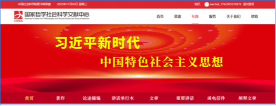 专题栏目包括:①习近平新时代中国特色社会主义思想,包括著作、论述摘编、讲话单行本、文章、重要讲话、函电信件、阐释文章等内容。②研究阐释宣传党的二十大和二十届二中、三中、四中全会精神,包括期刊文章、期刊、报纸和多媒体。③建设中国特色新型智库,包括政策、报道、专家建议、智库研究和专家成果。④古典学研究,包括外文图书、古籍、期刊和世界古典学大会等内容。