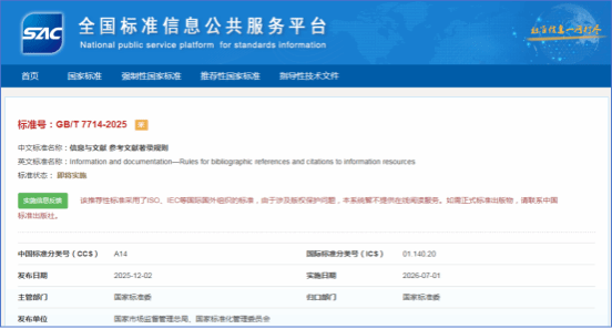 2025年12月2日,由武汉大学、中国科学院文献情报中心、中国科学技术信息研究所、北京师范大学出版社(集团)有限公司、北京大学、华中师范大学、中国科学院计算机网络信息中心、《中华医学杂志》社有限责任公司、中国科学技术期刊编辑学会、中国标准化研究院、北京万方数据股份有限公司、同方知网数字科技有限公司联合起草的《信息与文献 参考文献著录规则》(GB/T 7714-2025)通过国家标准化管理委员会正式发布,并于2026年7月1日正式实施,届时,将全部替代GB/T 7714-2015标准。