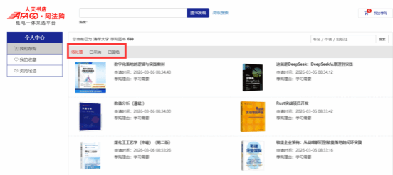 【个人中心】→【我的荐购】中可查看到所有的荐购书目,及图书馆的采纳情况。