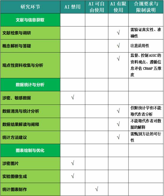该文件指出:①不得使用生成式人工智能直接生成申报材料;②依规合理使用生成式人工智能参与研究实施;③使用生成式人工智能生成的内容,特别是涉及事实和观点等关键内容的,应明确标注并说明其生成过程,确保真实准确和尊重他人知识产权;④对其他作者已标注为人工智能生成内容的,一般不应作为原始文献引用,确需引用的应加以说明;⑤不得直接使用未经核实的由生成式人工智能生成的参考文献;⑥生成式人工智能不得列为成果共同完成人;⑦应在研究方法或附录等相关位置披露使用生成式人工智能的主要方式和细节。